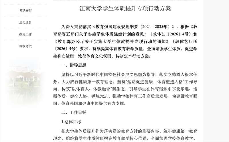 4月7日,江南大学教务处发布《江南大学学生体质提升专项行动方案》,对学校体育教育进行全面升级。学校将针对BMI超过28的肥胖学生群体,增开减脂类专项课,针对身体素质较弱的学生群体,增开体适能类专项课,都为必修课。
