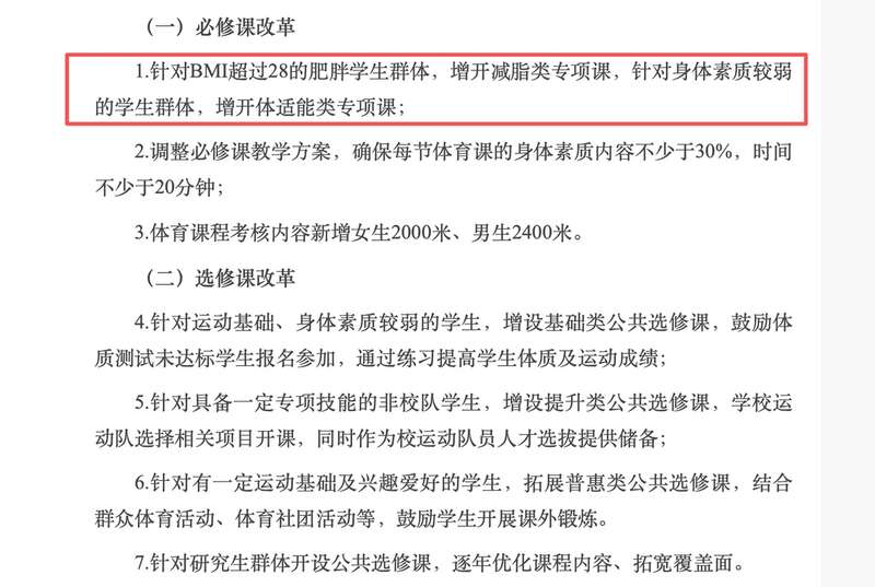 其中,必修课改革具体的内容为:针对BMI超过28的肥胖学生群体,增开减脂类专项课,针对身体素质较弱的学生群体,增开体适能类专项课;调整必修课教学方案,确保每节体育课的身体素质内容不少于30%,时间不少于20分钟;体育课程考核内容新增女生2000米、男生2400米。