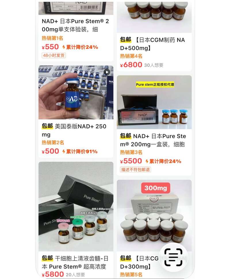 记者在闲鱼平台看到,有卖家直接出售多款所谓“院线同款”的NAD+针剂,产地包括日本、英国、美国等,品牌各异。以最便宜的单支50毫克定价550元的针剂为例,卖家向记者介绍:“自行复配100毫升盐水就可以注射使用,保证正品。”