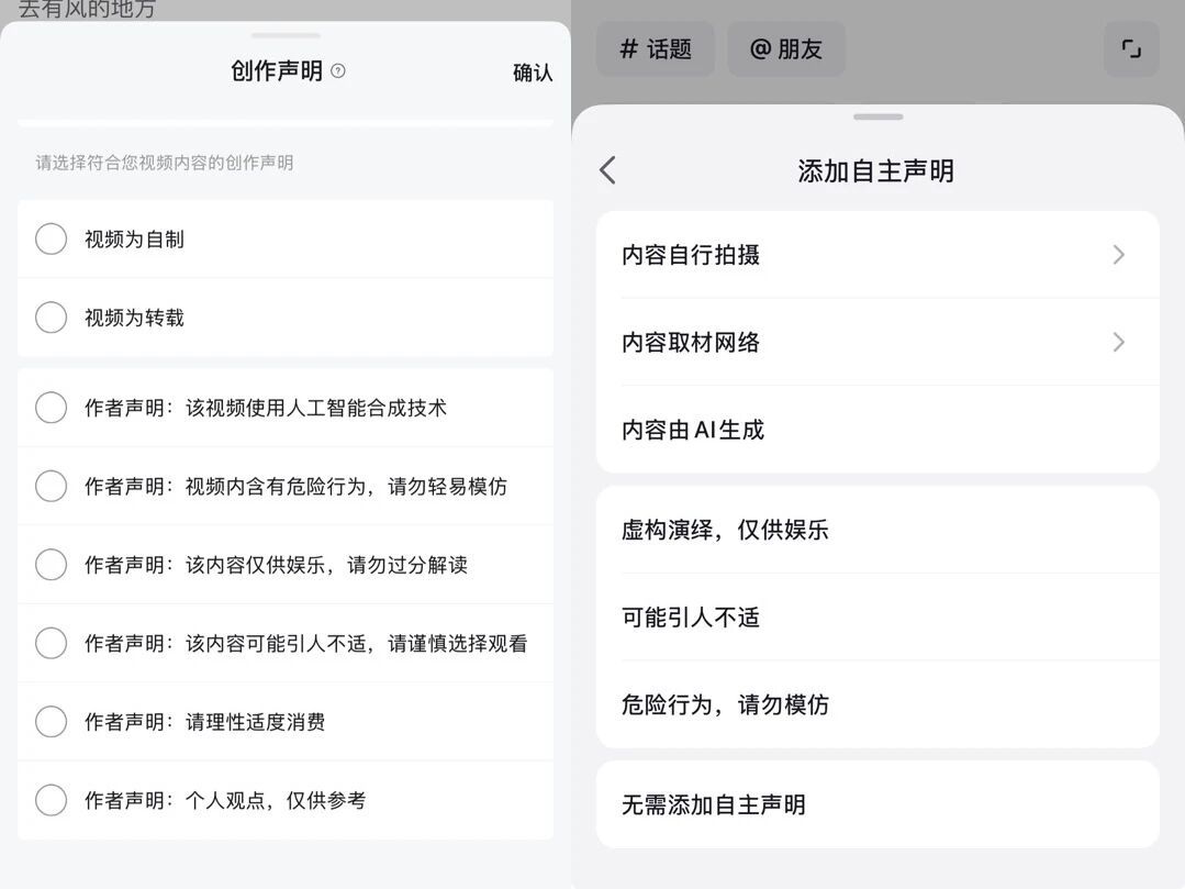 目前,各个平台均将“创作声明”设置在内容发布界面的必经环节,但是否标注“使用人工智能合成技术”则全权交由发布者裁定,对于创作者声明的标准,在细分栏目和形式上,不同平台之间并不统一。