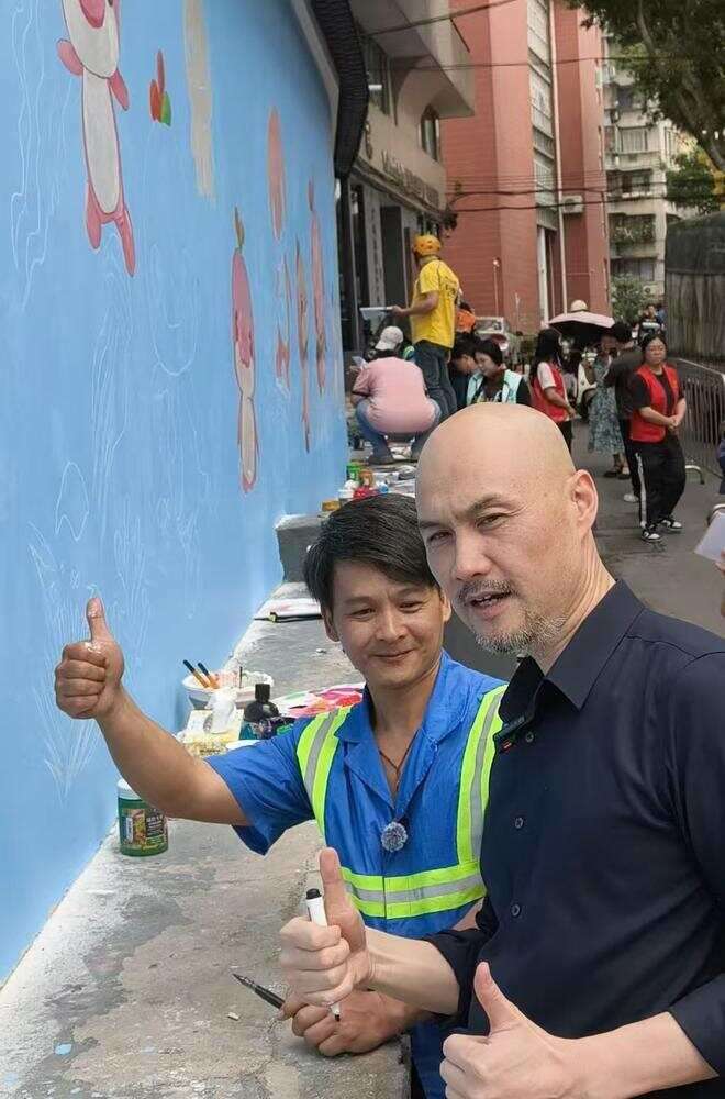 更令人惊喜的是,广州杂技团还特别邀请了“大湾鸡”形象主创、广州美术学院视觉艺术设计学院院长刘平云到场,与骆师傅一同创作。刘平云现场指导并参与墙画绘制,为这面凝聚群众力量的墙画增添了“大师作”的色彩。