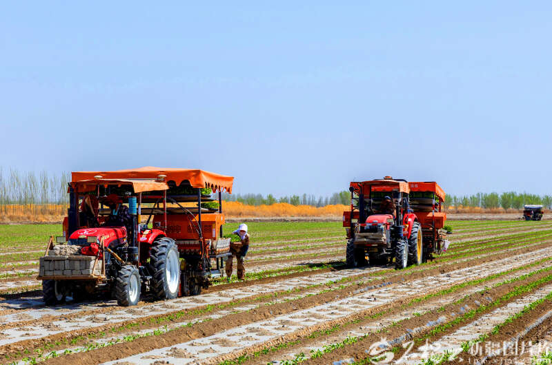 4月8日,新疆生产建设兵团第二师223团5连一处田间,职工驾驶农机移栽辣椒苗。眼下,该师22.1万亩辣椒移栽工作全面铺开。姬安妮摄
