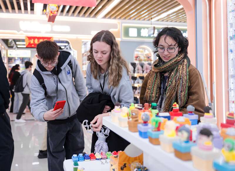 随后,国际生们移步全球数贸中心,在饰品、潮玩、AI机器人、无人机及美妆等热门展区,见证了从传统小商品的创新设计,到智能穿戴、商用无人机等前沿科技的落地应用,感受到了“中国智造”的惊喜。谈起印象最深刻的产品,来自印尼的史蒂文(Steven)对各种智能设备赞不绝口:“特别是机器狗和各类 AI 驱动的智能设备,比如智能眼镜、智能戒指、智能行李箱等等,这种技术进步的程度,我在其他地方从未见过。”