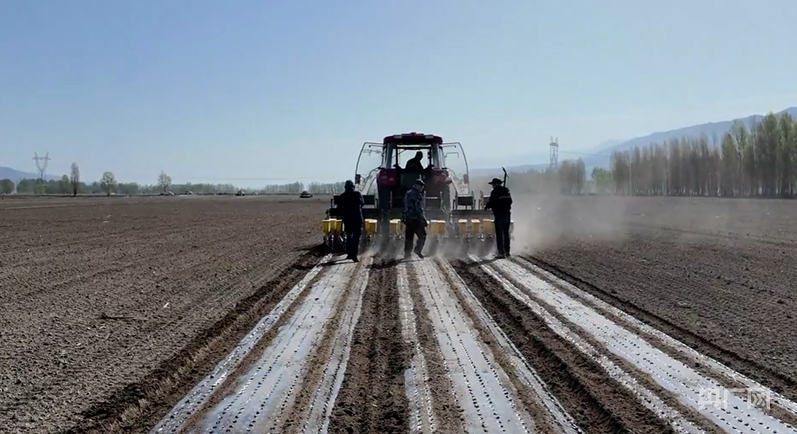 与传统人工铺膜相比,机械化作业优势尽显。一台农机一天便能完成数十亩地的铺膜、铺滴灌带、打孔全套作业,效率是人工的3至5倍。这不仅大幅缩短了春播周期,更为后期洋葱的高产优收筑牢了坚实基础。特克斯县乔拉克铁热克镇农机大户焦富裕一边专注地盯着农机作业,一边说:“三台机器在作业,播种、铺膜、滴灌带一次性完成,一台机器一天能种80至90亩。”