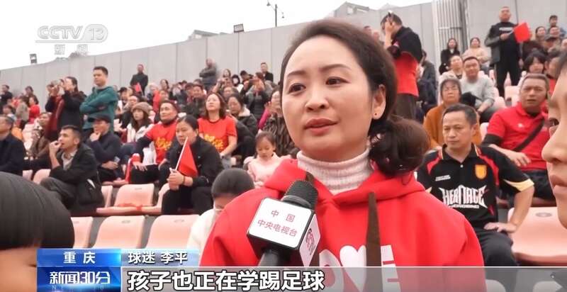 球迷 李平:我们每一场都来,我们也喜欢,孩子也喜欢,孩子也正在学踢足球。