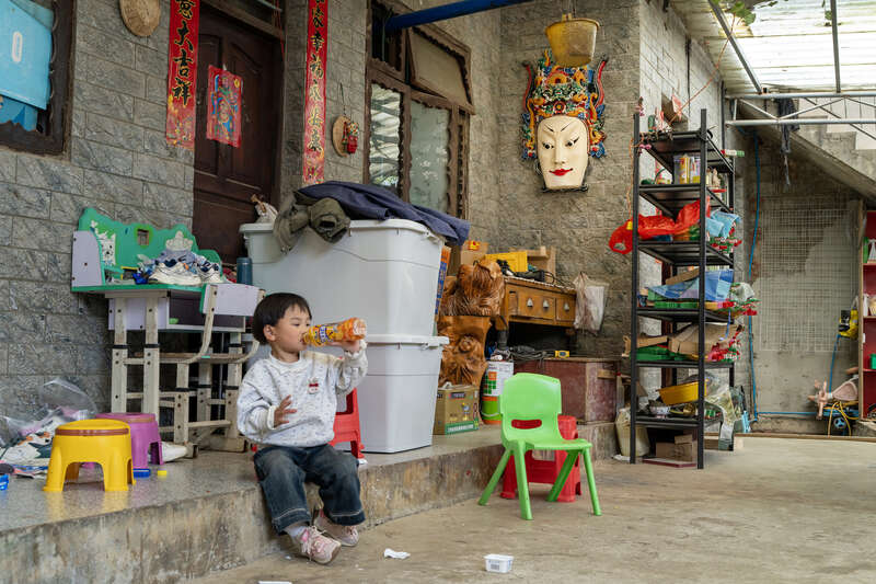 4月5日,贵州省安顺市西秀区刘官乡周官村,一名小朋友在家中的院子里喝饮料,院子的墙上挂着地戏面具。这里有约80%的村民靠木雕工艺品收入作为收入来源,安顺木雕也融于百姓的生活中。刘嵩/摄