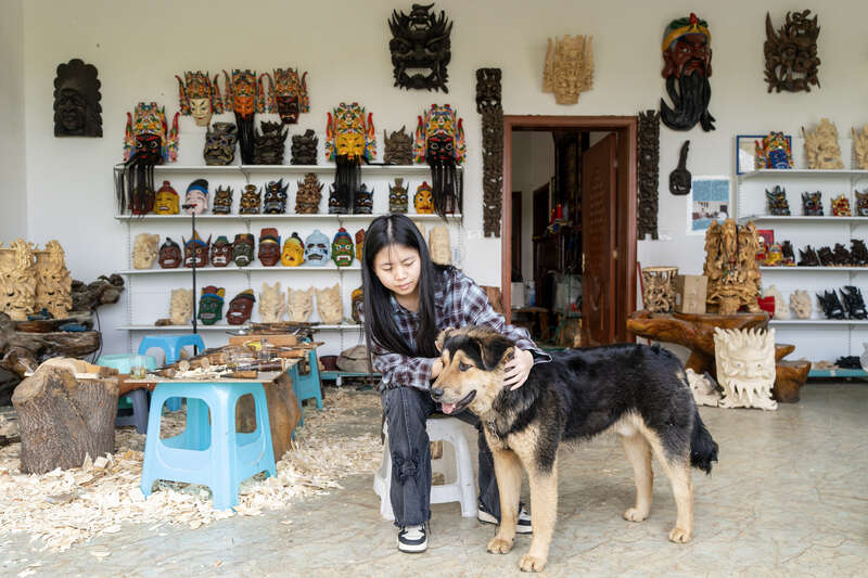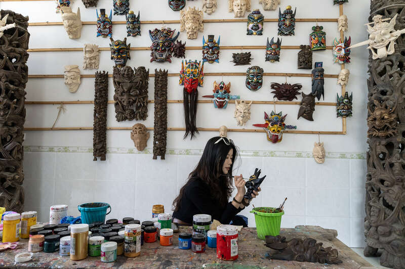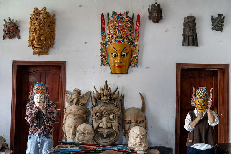 4月5日,贵州省安顺市西秀区刘官乡周官村,两名年轻人在木艺工坊内试戴当地特色木雕面具。这些面具是国家级非遗——安顺地戏的重要道具。近年来,一些年轻的传承者尝试着为这份古老技艺寻找新的表达,开设非遗木雕体验馆和相关体验项目,还创作以屯堡文化为主体、傩雕为核心的“屯雕”文创产品,让这份源自乡土的审美走进大众视野。刘嵩/摄