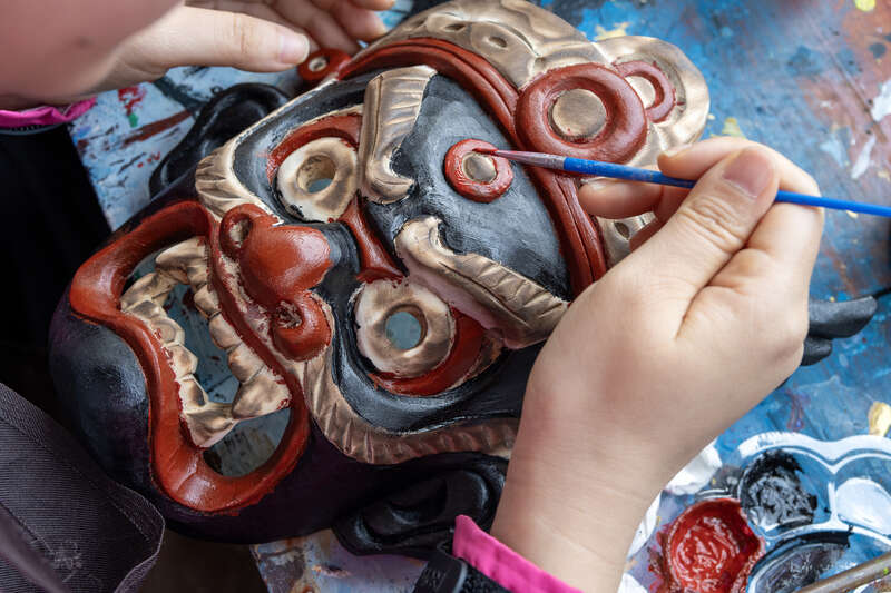 4月5日,贵州省安顺市西秀区刘官乡周官村,一名年轻人正在体验制作木雕面具。从选材到雕刻再到上色,游客可以在传承人或老师傅的指导下,完成一件属于自己的面具。刘嵩/摄