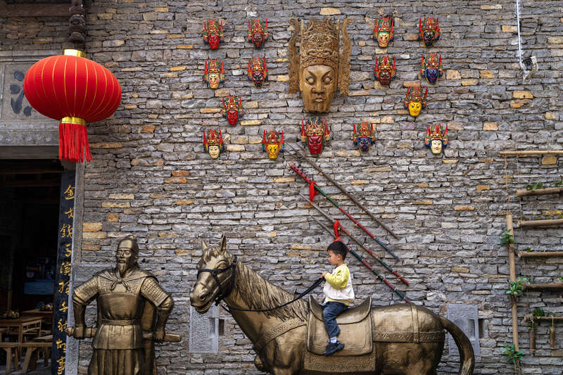 4月5日,贵州省安顺市平坝区天龙屯堡古镇,一名小朋友在骑马玩耍,墙面挂着地戏面具。刘嵩/摄