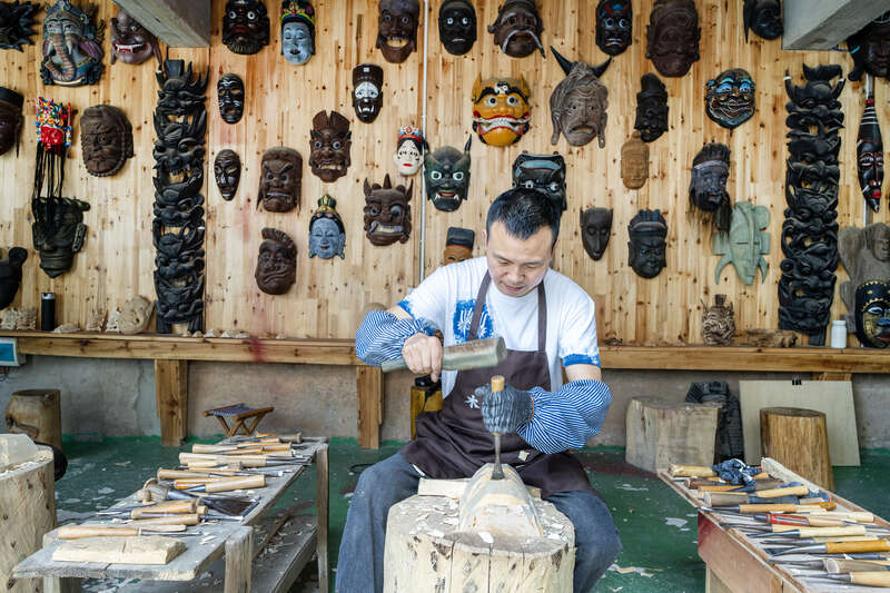 4月5日,贵州省安顺市西秀区刘官乡周官村,非物质文化遗产“安顺木雕”项区级传承人鲍文红正在制作木雕面具,他创办的“雅兰木艺工坊”体验馆,吸引到了来自全国各地文化、艺术爱好者前来体验制作木雕面具。刘嵩/摄