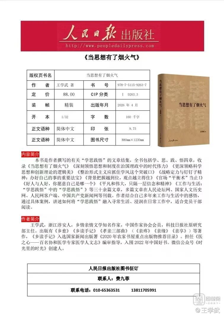 《当思想有了烟火气》是作者撰写的有关“学思践悟”的文章结集,人民日报出版社2026年4月最新出版。全书包括学、思、践、悟四章,收录《当思想有了烟火气》《深刻领悟思想和制度在治国理政中的时代伟力》《更深领略科学思想和创新理论的逻辑美》《整治形式主义应抓住学风这个突破口》《战略定力与钉钉子精神:办好自己的事的重要法宝》《背景把握越到位,观点越立得住》《官场“平衡术”当止!》《好人与人好,你愿意自己是哪一个》《平凡和伟大,只隔一层信念和精神》《工作与生活:“学思践悟”中的“学思践悟”》等三十余篇文章,多篇文章在人民论坛网、国家人文历史网、人民网客户端、中国共产党新闻网等刊载。作者结合自己多年来工作与生活中的感悟,通过具体案例,讲述如何将“学思践悟”融入寻常生活、浸润在日常工作中,适合党员干部阅读。