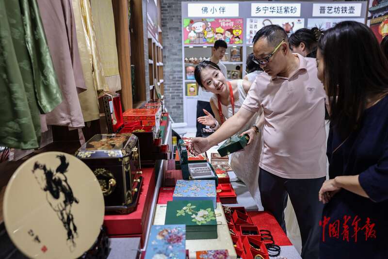 4月15日,海南海口,第六届消博会国货精品展区,参观者在山西展团展位上参观平遥唐都漆器。平遥唐都推光漆器是国家级非物质文化遗产,历史悠久,自商周起便显雏形,唐开元年间形成以“手掌推光”和“描金彩绘”为主的独特工艺,沿袭至今。中青报·中青网记者 曲俊燕/摄