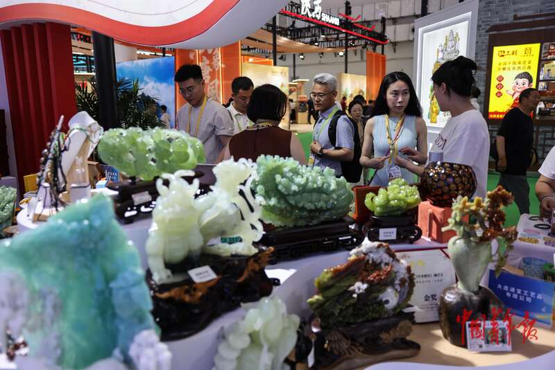 4月15日,海南海口,第六届消博会国货精品展区,参观者在辽宁展团展位上参观岫岩玉雕等各类非遗工艺品。辽宁省目前已公开的省级非遗代表性项目共有428项,其中入选国家级非遗代表性项目76项,全省非遗工坊约300家,县区覆盖率达92%,为全面推进乡村振兴提供助力。在本届消博会上,各地代表性非遗项目吸引了许多参观者现场观摩、选购。中青报·中青网记者 曲俊燕/摄