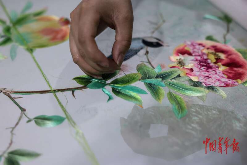 4月15日,海南海口,第六届消博会国货精品展区,湖南展团展位上,湖南省湘绣研究所有限公司湘绣非遗代表性传承人黄春艳现场展示双面全异绣作品《雀舞榴枝》,正反两面同时绣制,图案不同。中青报·中青网记者 曲俊燕/摄