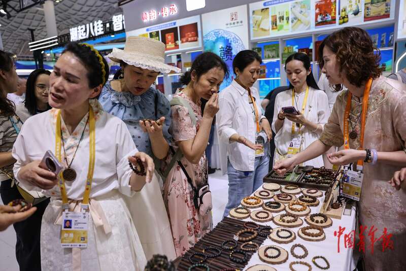 4月15日,海南海口,第六届消博会国货精品展区,江西展团新余裕香堂文化发展有限公司展位上,用中草药原料压制成珠的手串吸引了众多参观者。裕香堂老字号品牌源于明代弘治年间,如今依托赣西地区“药都”形成独特药香派系,成为江西省省级非物质文化遗产代表性项目,并建立非遗传承保护基地。中青报·中青网记者 曲俊燕/摄