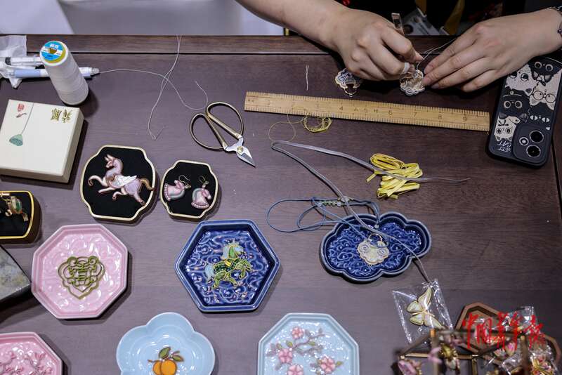 4月15日,海南海口,第六届消博会国货精品展区,上海展团龙凤旗袍展位上,非遗代表性传承人现场展示盘扣的制作。中式服装制作技艺(龙凤旗袍手工艺制作技艺)是国家级非物质文化遗产代表性项目,盘扣形式有盘香扣、琵琶扣等,如今随着技艺的精进,盘扣不仅仅是旗袍的一部分,更成为“万物皆可盘”的上海伴手礼。中青报·中青网记者 曲俊燕/摄