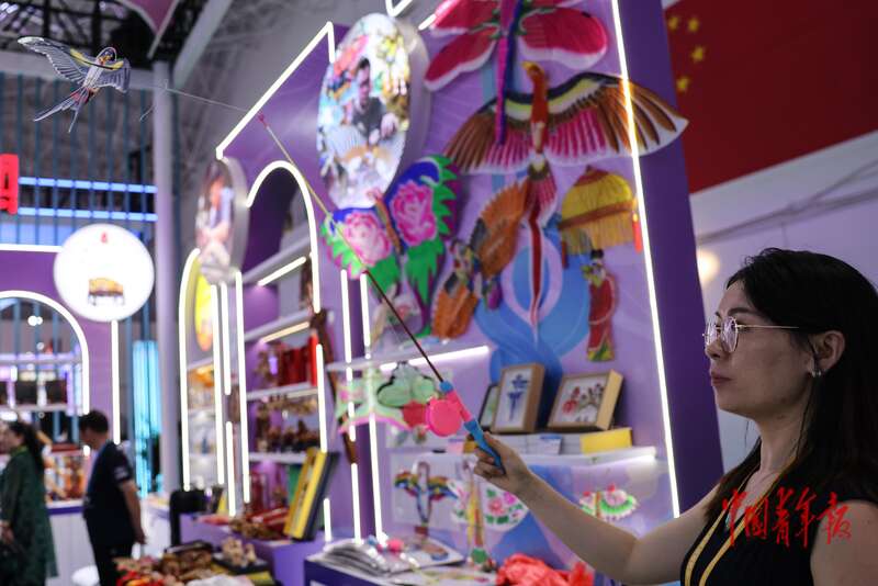 4月15日,海南海口,第六届消博会国货精品展区,山东展团的参展商在潍坊风筝展位前挥舞小风筝。潍坊风筝制作技艺于2006年被列入第一批国家级非物质文化遗产名录。中青报·中青网记者 曲俊燕/摄