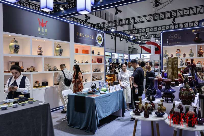 4月15日,海南海口,第六届消博会国潮出海展区,参观者在国瓷臻选×景德镇制瓷展位上参观。展区汇集非遗瓷器艺术品、传统手工茶器与现代陶瓷工业生活用品,既展示非遗烧制技艺与经典作品,也呈现陶瓷工艺在现代家居、日用消费中的创新应用。中青报·中青网记者 曲俊燕/摄