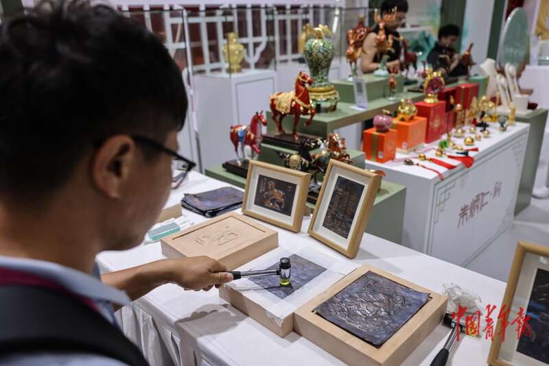 4月15日,海南海口,第六届消博会国货精品展区,参观者在浙江展团朱炳仁·铜展位体验拓铜画制作。中国工艺美术大师朱炳仁是第三批国家级非物质文化遗产代表性项目铜雕技艺代表性传承人。中青报·中青网记者 曲俊燕/摄