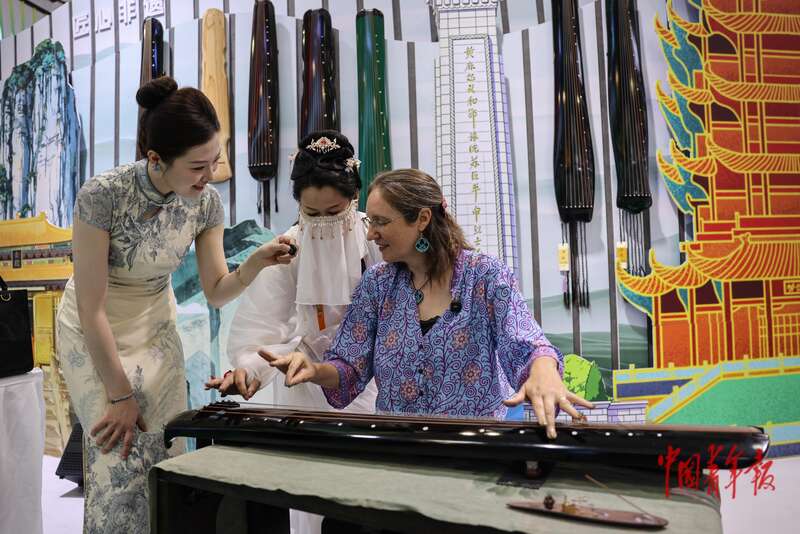 4月15日,海南海口,第六届消博会国货精品展区,湖北展团鄂州斫琴堂梵舟琴坊展位上,琴人黄滢滢(中)向外国参观者介绍古琴技法,这张古琴价值35万元。该琴坊的古琴制作取材自200年以上的老房梁木,每根木材的品种、纹路、年份都会影响琴的音质。一张琴从选木到制成,全程需要两年半的时间,产量十分有限,价格不菲。中青报·中青网记者 曲俊燕/摄
