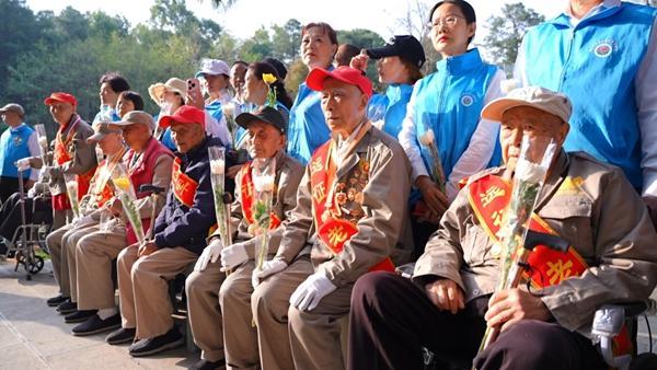 在家人和志愿者的搀扶下,8位老人庄严列队,举手行军礼。101岁老兵廖沛林声音颤抖、几度哽咽,可每一个字都说得清清楚楚:“又是一年春草绿,面对青山祭忠魂。中华儿女世世代代都不会忘记你们。如今国泰民安,是你们用鲜血、用生命换来,感谢你们!”