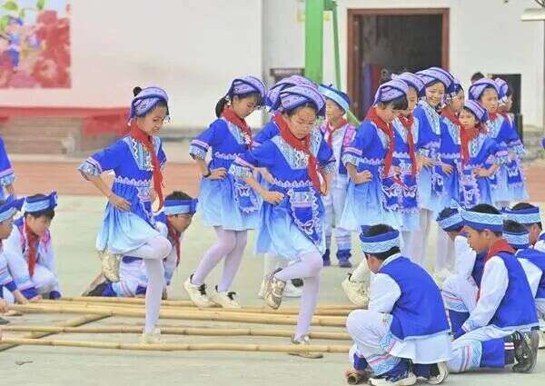 △4月15日,广西梧州市长洲区龙平小学学生在跳竹竿舞。当日,该校举行“石榴花开一家亲 同心喜迎‘三月三’”主题活动,师生们通过唱山歌、跳竹竿舞等丰富多彩的活动,喜迎传统节日“三月三”。(新华社记者 黄孝邦/摄)