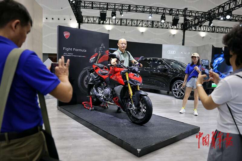 4月16日,海南海口,第六届消博会免税与高端精品展区,一名参观者与杜卡迪摩托车合影。中青报•中青网记者 曲俊燕/摄