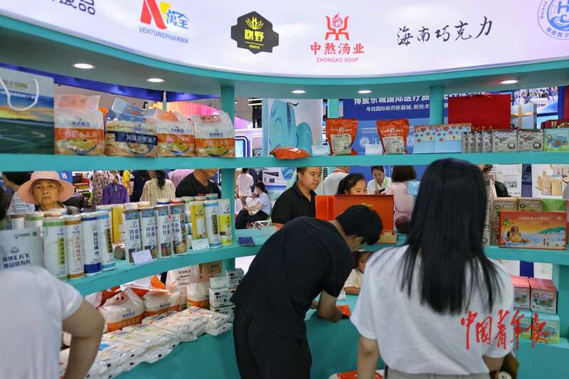 4月16日,海南海口,第六届消博会国货精品展区海南展位上,各类特色食品吸引参观者目光。中青报•中青网记者 曲俊燕/摄