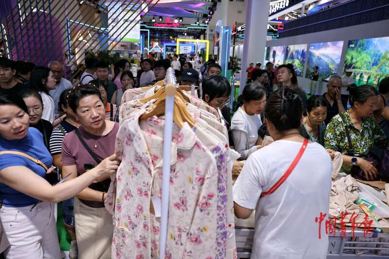 4月16日,海南海口,第六届消博会国货精品展区,新疆生产建设兵团展位上,参观者在选购中国彩棉(集团)股份有限公司生产的家居服。中青报•中青网记者 曲俊燕/摄