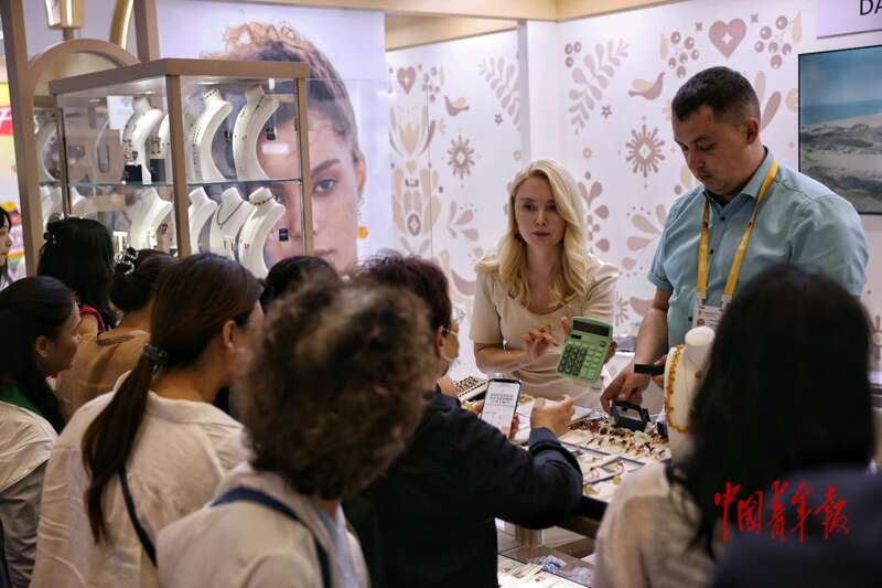4月16日,海南海口,第六届消博会全球特色消费展区,俄罗斯出口中心展位上,参展商向参观者展示一款首饰的价格。中青报•中青网记者 曲俊燕/摄