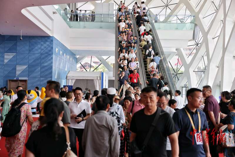 4月16日,海南海口,第六届消博会全球特色消费展区外,络绎不绝的参观者乘电梯穿梭在展区之间。中青报•中青网记者 曲俊燕/摄