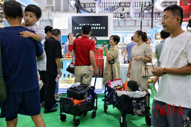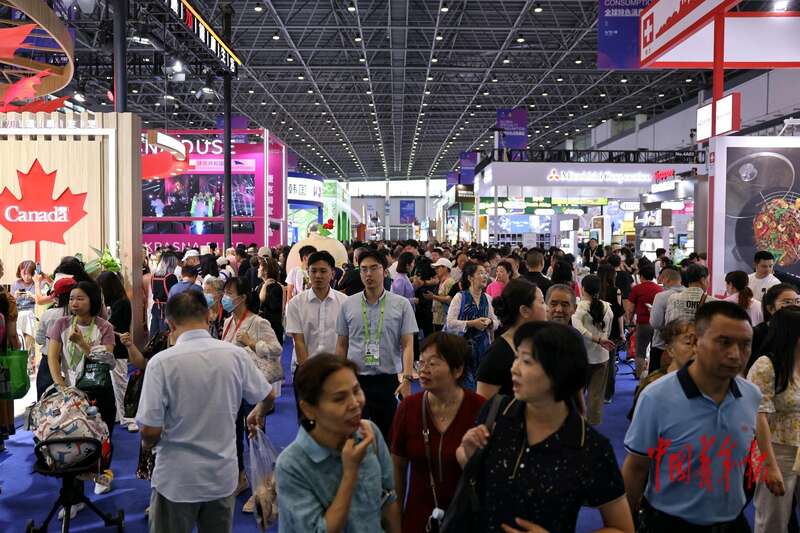 4月16日,海南海口,第六届消博会全球特色消费展区,熙熙攘攘的观展人群。当日,第六届消博会迎来首个公众开放日,全球特色消费、国货精品等展区人气高涨,美食、高端消费品等展位吸引了大量参观者亲身体验。不少参观者拖着购物车或野营车,全家老小齐出动,把全球精选好物带回家。公众开放日将持续至4月18日。中青报•中青网记者 曲俊燕/摄