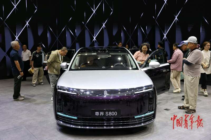 4月16日,海南海口,第六届消博会免税与高端精品展区,华为尊界S800电动车吸引了不少参观者。这款车价格为109万元,是国产电动车中的“顶流”。中青报•中青网记者 曲俊燕/摄
