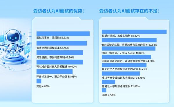 调查显示,58.63%受访者认为AI面试效率高、流程快。此外,节省交通时间和成本(53.46%),灵活便捷、不受时空限制(49.90%),可以减少面对真人的紧张感(49.00%),评分标准统一、更公平公正(38.91%)等,也是受访大学生认可的AI面试优点。
