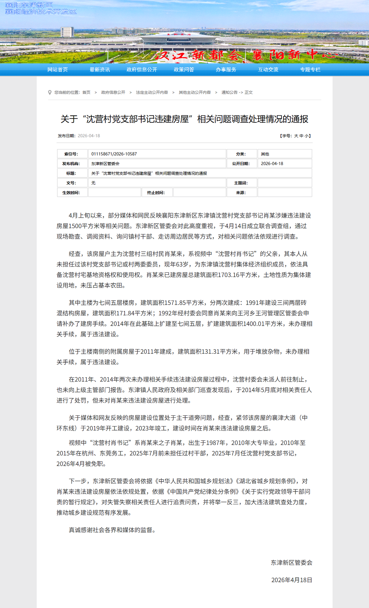 4月上旬以来,部分媒体和网民反映襄阳东津新区东津镇沈营村党支部书记肖某涉嫌违法建设房屋1500平方米等相关问题。东津新区管委会对此高度重视,于4月14日成立联合调查组,通过现场勘查、调阅资料、询问镇村干部、走访周边居民等方式,对相关问题依法依规进行调查。