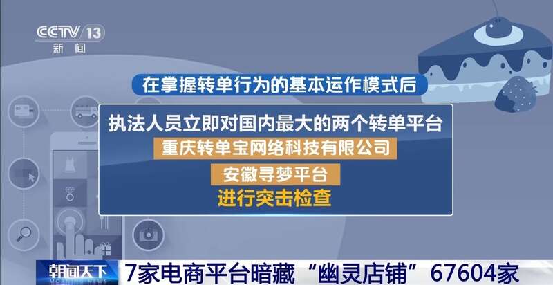 市场监管总局执法稽查局稽查四处处长 韩冰:“幽灵店铺”,大型电商平台,转单平台,最后由线下店铺接单,然后通过本地快递送给消费者,在这个利益链条中,我们认为转单平台是一个枢纽,于是我们就对国内大型的转单平台进行了现场检查。调取数据发现,全国有至少七家电商平台有这种转单的行为。