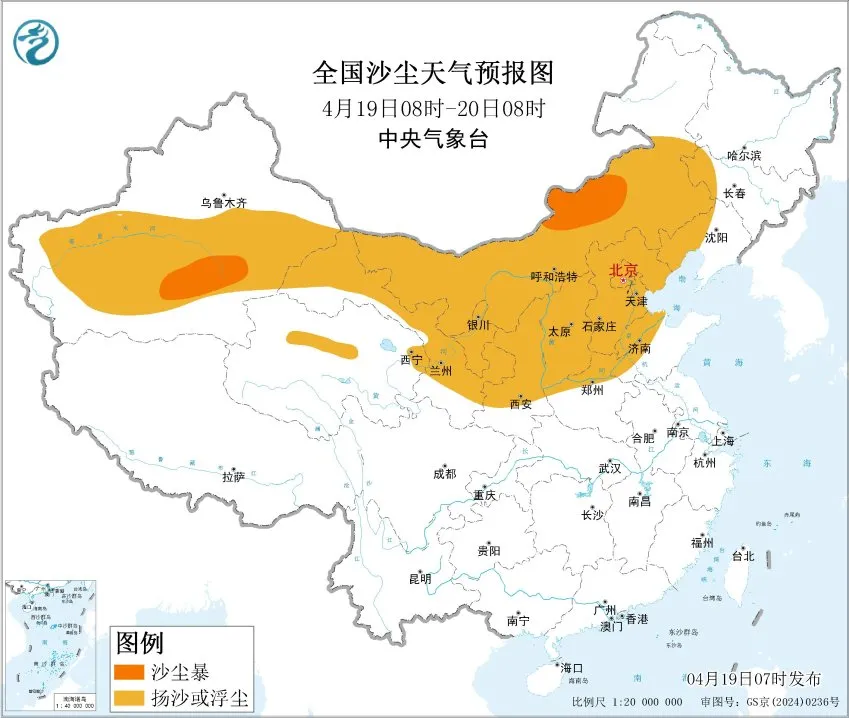 受冷空气影响,4月19至20日,北方多地出现大风天气,部分地区伴有扬沙或浮尘,新疆南部、内蒙古中部等地部分地区有沙尘暴;19日至23日,新一轮冷空气将影响我国,带来大风、降雨、强对流等天气,部分地区有10级以上雷暴大风或冰雹天气,小时雨量达50毫米。中国气象局于19日9时进入重大气象灾害(大风、强对流)四级应急响应状态。