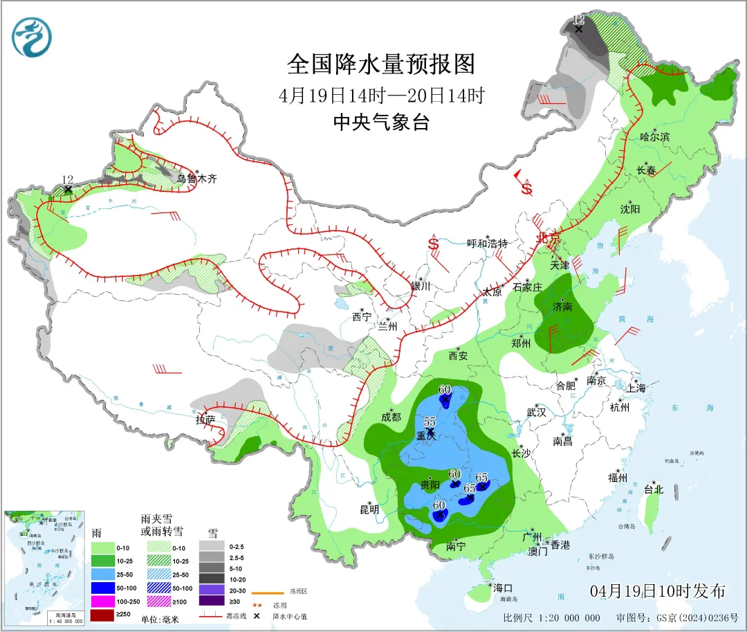 此外,19日白天至夜间,华北东部和南部、黄淮大部、江汉西部、西南地区东部和南部、华南西部等地的部分地区将有雷暴大风或冰雹天气,部分地区将有10级以上雷暴大风,最大风力可达11级以上;华北地区南部、黄淮中西部、西南地区东部和南部、华南地区西部等地的部分地区将有短时强降水天气,部分地区小时雨量大于50毫米,最大可达60毫米以上。20日至23日,西南地区东部、江南、华南等地的部分地区仍有短时强降水天气,贵州、江南南部和华南中西部局地仍有雷暴大风或冰雹天气。