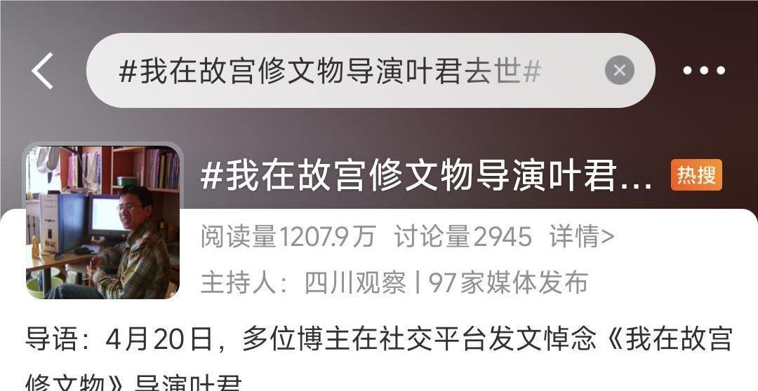 4月20日,纪录片《我在故宫修文物》导演叶君因急性胃出血不幸离世,年仅43岁。据悉,他在三月底刚做完体检,仅查出轻微胃部炎症,无重大健康问题。