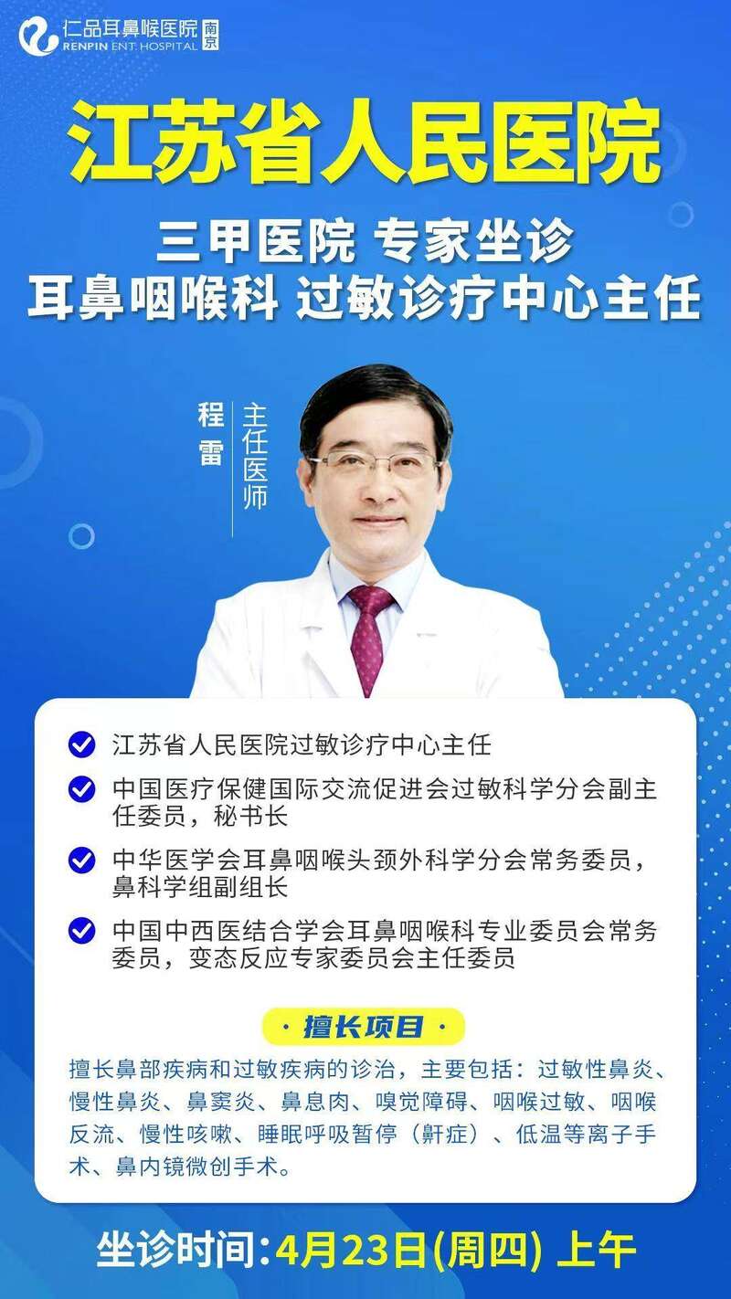 为方便广大过敏患者咨询就诊,4月23日上午,程雷教授将在南京仁品耳鼻喉医院坐诊,针对过敏性鼻炎的预防、日常护理、规范治疗等问题提供专业指导,同时为患者进行一对一面诊,量身制定针对性诊疗方案。由于号源有限,有需要的市民可致电025—57888888或添加医院微信公众号提前预约,避免错过就诊机会。