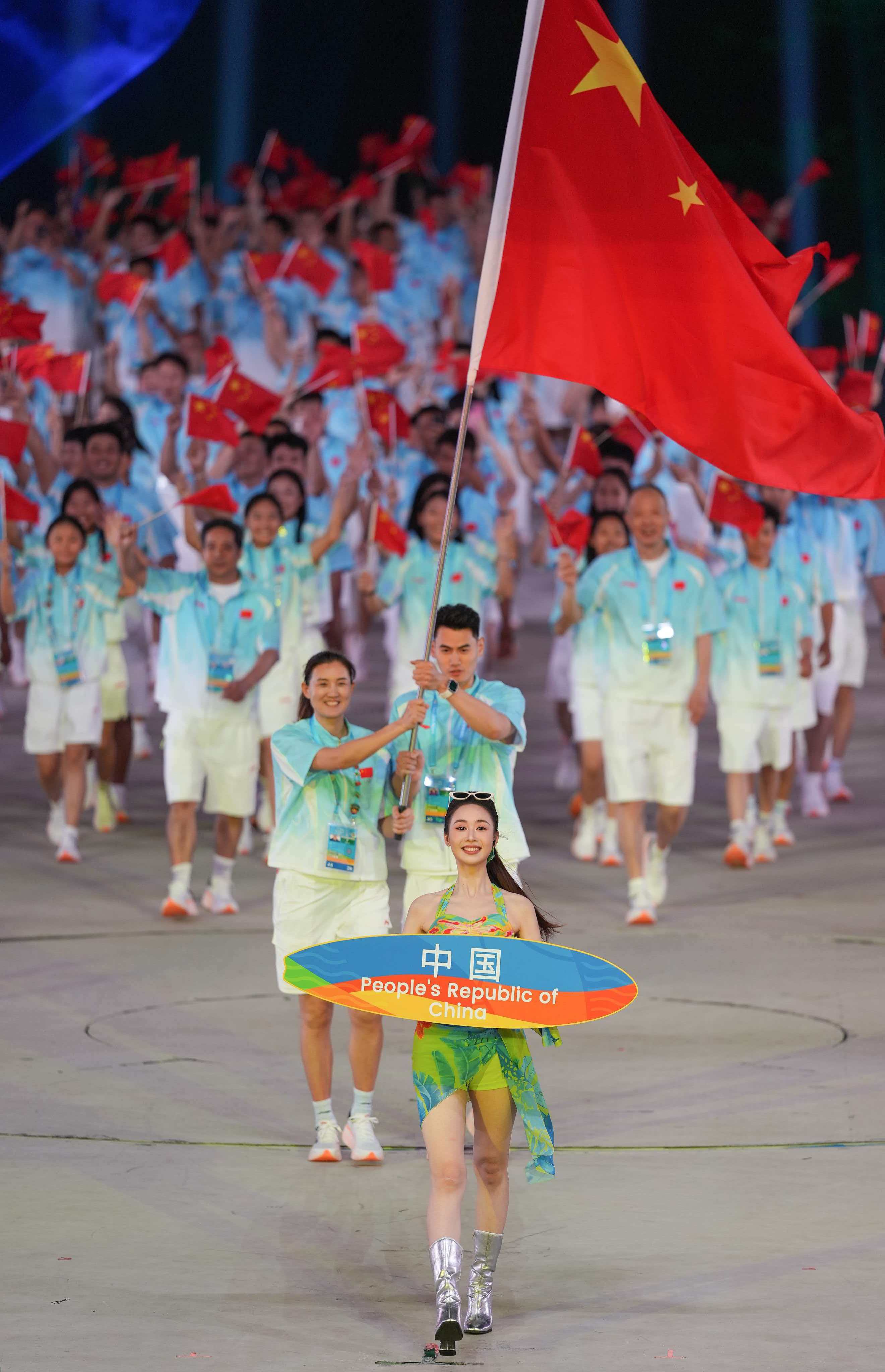 开幕式运动员入场仪式也在开放环境中展开。东道主中国体育代表团压轴入场。本届亚沙会,中国代表团由255人组成,其中171名运动员,参赛规模为历届亚沙会之最。沙滩手球运动员沈萍与三人篮球运动员颜鹏担任开幕式中国代表团的旗手。
