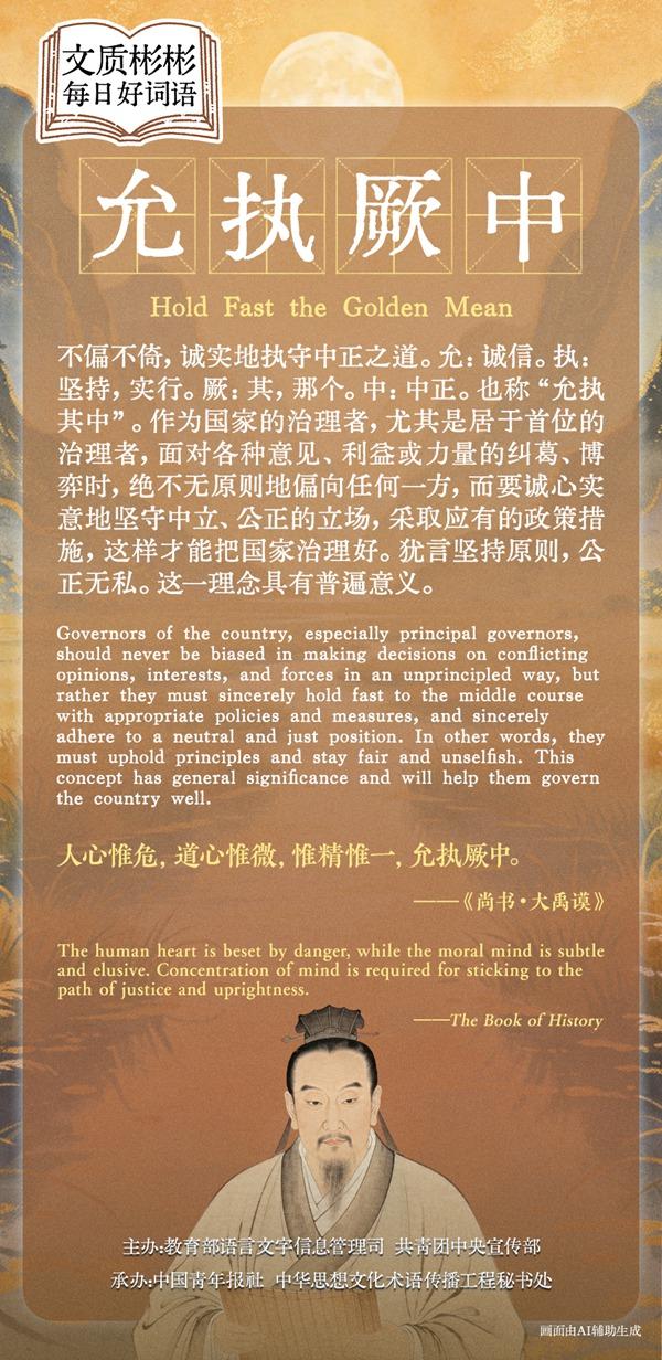 不偏不倚,诚实地执守中正之道。允,诚信;执,坚持,实行;厥,其,那个;中,中正。也称“允执其中”。国家的治理者,尤其是居于首位的治理者,面对各种意见、利益或力量的纠葛、博弈时,绝不无原则地偏向任何一方,要诚心实意地坚守中立、公正的立场,采取应有的政策措施,这样才能把国家治理好。犹言坚持原则,公正无私。这一理念具有普遍意义。