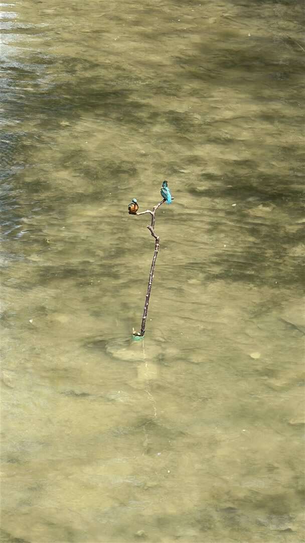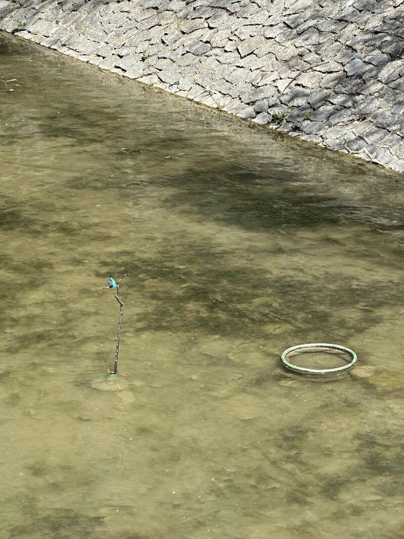 他还补充说,这中间的“造景杆”会时常更换,“这根应该刚换不久。等四月底五月初,小翠鸟孵化出来,一家子出来活动,这里站不下了,就会有人再换根更宽的。有时还会换上花枝,就为了让画面更有‘意境’。”记者在河边的草丛里,看到了几根造型各异的树枝,正在等着被“更换”。