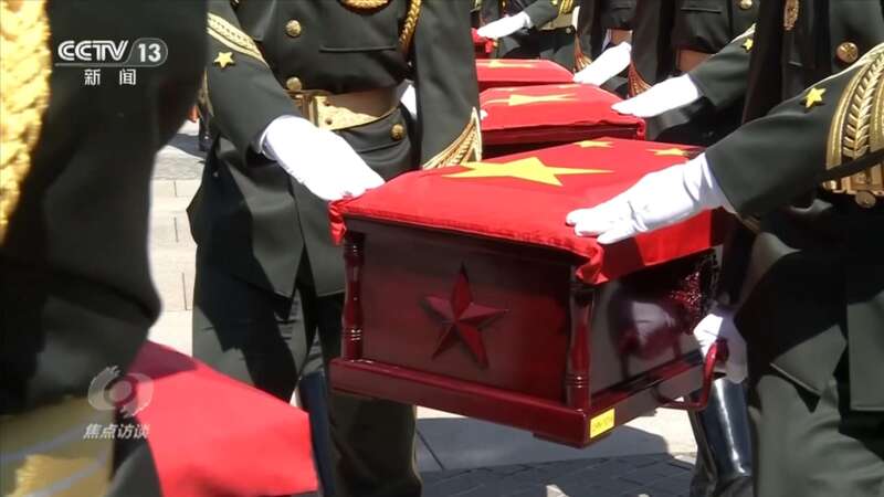 运-20B运输机降落在沈阳桃仙国际机场后,机场以“过水门”最高礼遇迎接志愿军烈士回家。在庄严肃穆的迎回仪式后,礼兵战士护送志愿军烈士遗骸棺椁及遗物登上军用卡车,在骑警护卫车队引领下,前往沈阳抗美援朝烈士陵园。从机场到陵园约30公里,有7万多名社会各界群众沿长街等候,向志愿军英灵致敬。