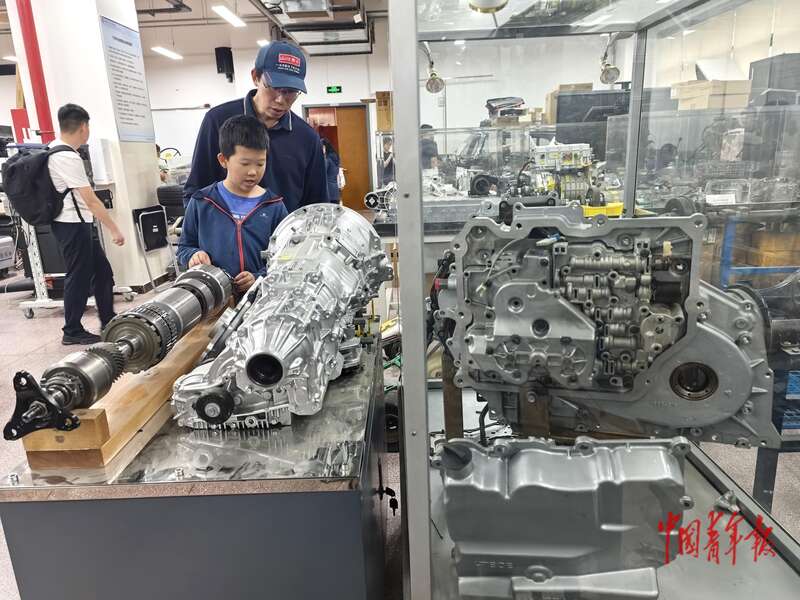 4月25日,北京,清华大学汽车系实验室,一位校友带着孩子在观看汽车的变速装置。中青报·中青网 陈剑/摄