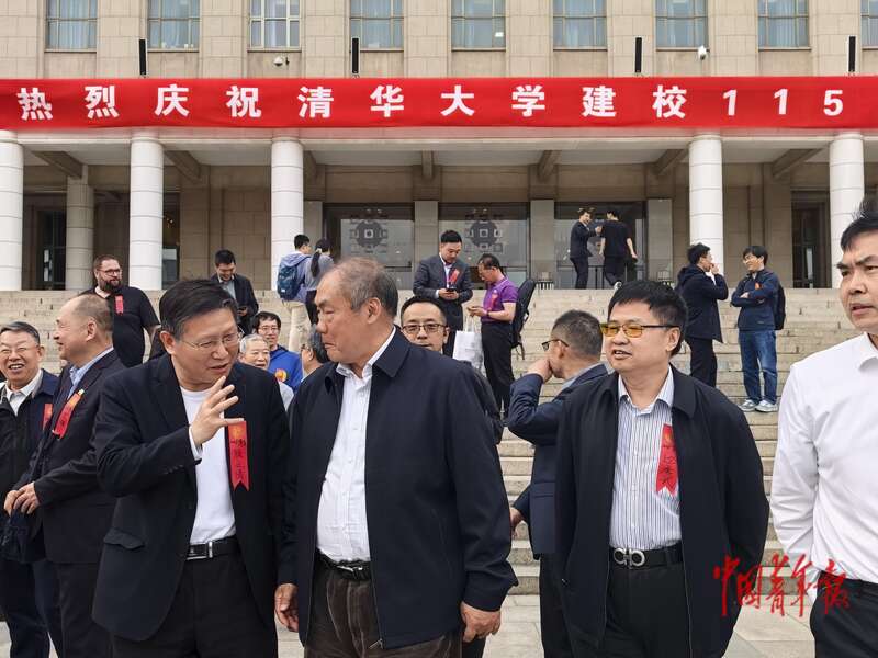 4月25日,北京,清华大学,博士后校友秩年座谈会后,校友们在会场外相互交流。校友顾文涛(前左)与身旁的张勤(中)交谈。中青报·中青网 陈剑/摄