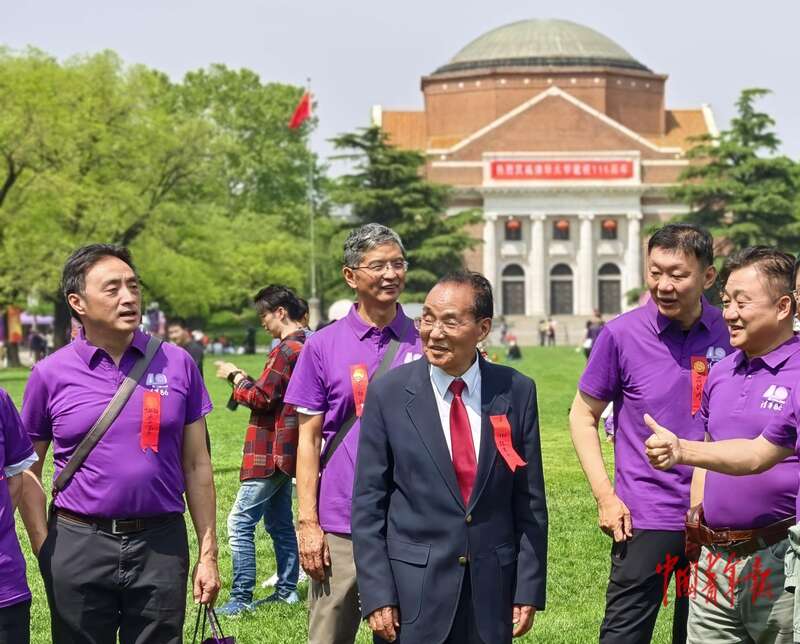 4月25日,北京,清华大学大礼堂前草坪,1960级校友张菊水(中)与1986级的部分校友在合影后相互交流。中青报·中青网 陈剑/摄