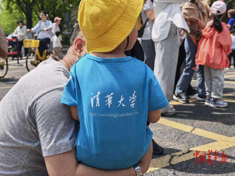 4月25日,北京,清华大学,一位校友准备将孩子抱起,孩子穿着一件印有“清华大学”字样的T恤衫。中青报·中青网 陈剑/摄