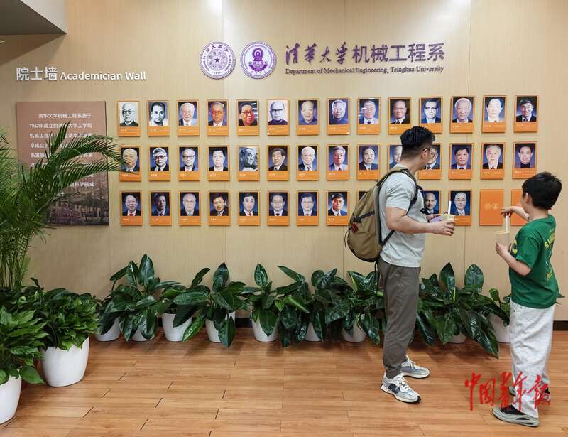 4月25日,北京,清华大学,一位校友带着孩子在机械工程系的院士墙前驻足。中青报·中青网 陈剑/摄