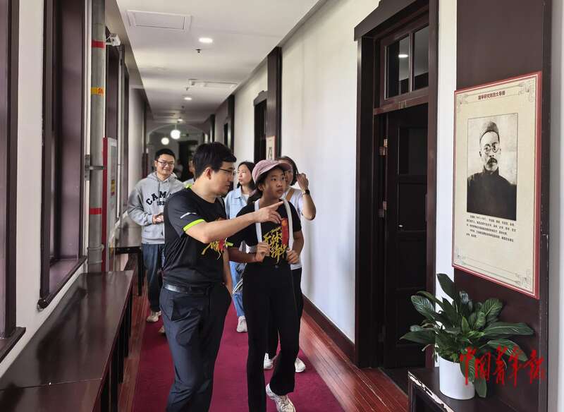 4月25日,北京,清华大学清华学堂,一位校友在国学大师王国维画像前,给身边的女儿介绍和讲解。1931年,梅贻琦出任清华大学校长,在就职典礼上讲道:“所谓大学者,非谓有大楼之谓也,有大师之谓也。”中青报·中青网 陈剑/摄